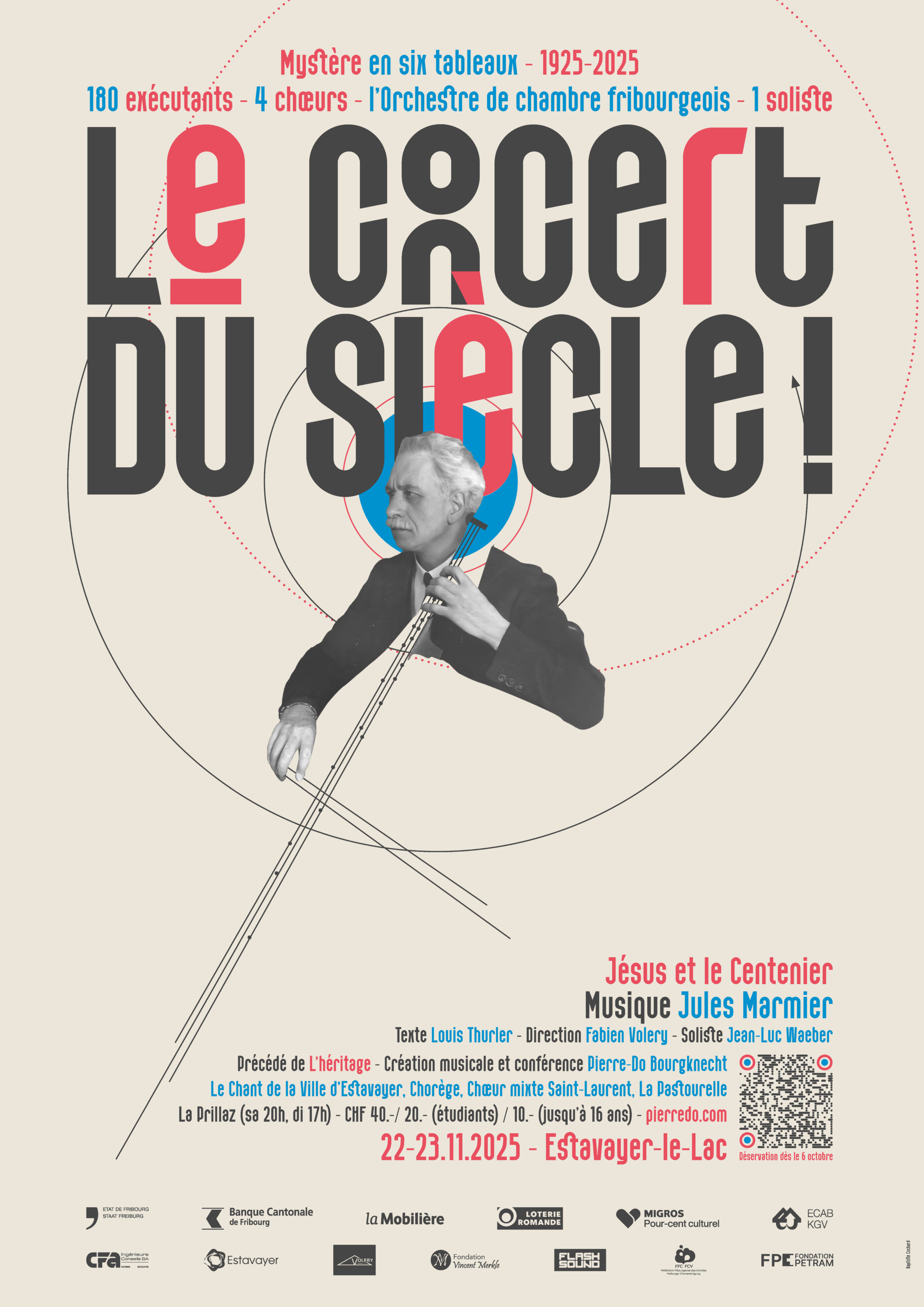 Un jour, Pierre-Do Bourgknecht, musicien et chroniqueur musical pour la RTS, a rêvé faire revivre la musique de son arrière-grand-père Jules Marmier, qui a longtemps vécu à Estavayer-le-Lac. Il a alors imaginé que 4 chœurs de la région d’Estavayer pourraient se réunir autour d’un orchestre professionnel pour réinterpréter « Jésus et le Centenier », une œuvre composée par son aïeul en 1925, soit il y a tout juste100 ans…